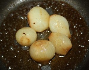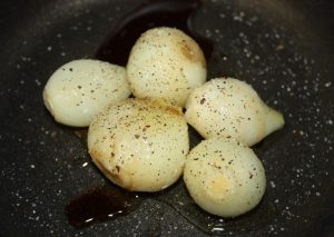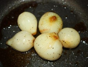 En una sartén poner la cucharada de aceite, las cebollitas, miel, PX, sal y pimienta.