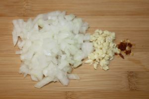 Picar la cebolla, ajo y guindilla.