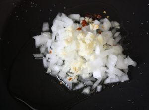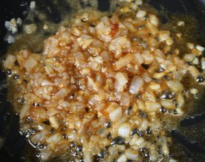 Pochar en una sartén con el aceite y una pizca de sal, a fuego fuerte. Cuando el aceite comience a chisporrotear, bajar el fuego al mínimo y dejar 10 minutos.