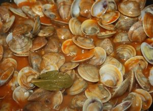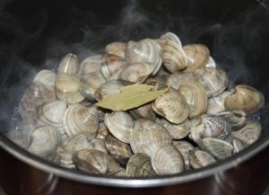 En un cazo bien caliente, poner las chirlas escurridas, con una hoja de laurel. Tapar y dejar hasta que se abran.