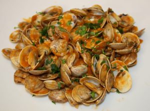 Poner las chirlas a remojo en un bol, cubiertas con agua y una cucharadita de sal, para que eliminen la arena que les pueda quedar. Una hora, cambiando el agua tres veces.