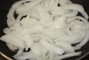 En una sartén con el aceite, pochar la cebolla, cortada en juliana, con una pizca de sal. 15 minutos a fuego bajo. Mover de vez en cuando.