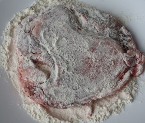 En una sartén, poner la mantequilla y el aceite. Fuego fuerte. Cuando la mantequilla se haya derretido, poner las cortadas de carne. Dorar por los dos lados. Tener cuidado no se os queme el aceite ya que, al llevar la carne harina, si se tuesta demasiado, amargará. Unos 2 minutos por cada lado. Pasar a una fuente de horno.