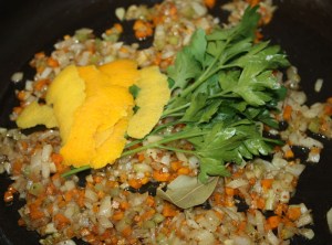 Poner las hojas de laurel, las pieles de los cítricos y el perejil.