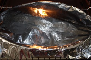 Tapar con papel de aluminio y meter en el horno, precalentado a 200º.