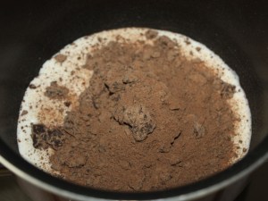 En un cazo poner la nata a hervir. Añadir el chocolate.