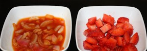 Misma cantidad de fresones y de cebollas rojas en vinagre.