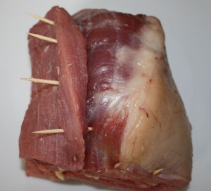 Colocar unos palillos para cerrar la carne, tanto por el centro como por los lados para que no se salga el relleno.