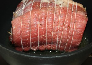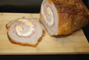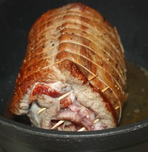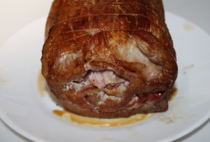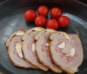 El día que la vayáis a utilizar, sacar la carne de la nevera, porque como os he dicho, se puede hacer con antelación. Quitar los hilos, y con mucho cuidado de que no se os escape el relleno, cortarla en rodajas, no muy finas o se os romperá.