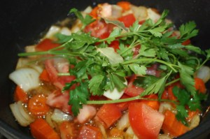 Añadir los ajos, tomate, perejil y laurel. Otros 2 minutos.