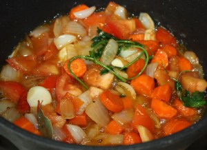 Cortar las verduras ( cebolla, zanahoría y tomate ) en mirepoix.