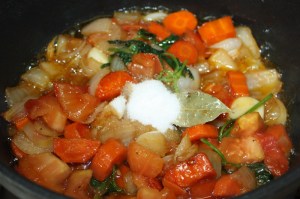 En la misma olla donde hemos dorado la carne, también vamos a dorar las verduras. Primero poner la cebolla y zanahoria. Salpimentar. 2 minutos a fuego fuerte.