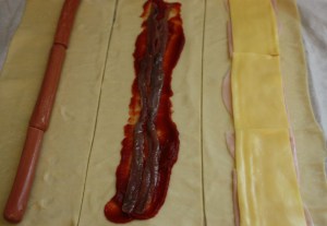 En uno colocar jamón y encima queso. En otro untar un poco de tomate concentrado y encima anchoas. En el último las salchichas.