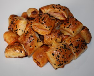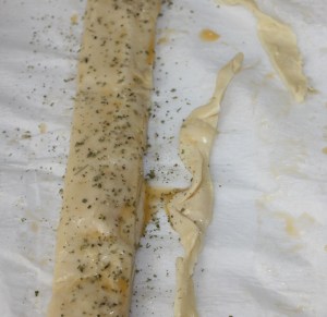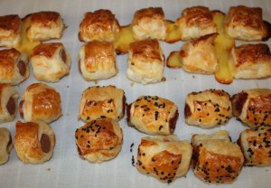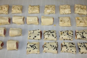 Sacar de la nevera y pintar con huevo. Si sobra masa, cortarla. Espolvorear los de jamón y queso con orégano seco y los de anchoas con semillas de sésamo negro. Cortar en porciones de unos 5 cm ( salen 6 de cada ).