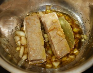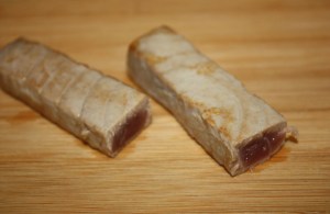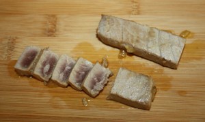 Sacar los lomos de atún de la marinada y cortar en rodajas ( este atún esta muy bueno para comer de cualquier manera ).