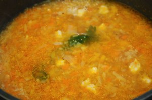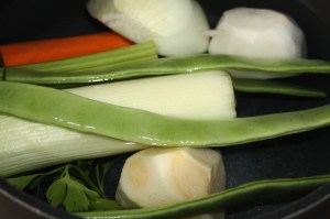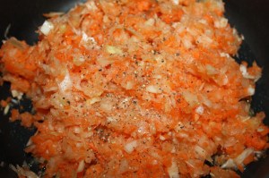 En la misma olla donde hemos hecho el caldo, pochar las verduras picadas: zanahoria, puerro, cebolla y ajo, con las 6 cucharadas de aceite y una pizca de sal y pimienta. Fuego medio – bajo, 10 minutos. Mover de vez en cuando para que no se queme.