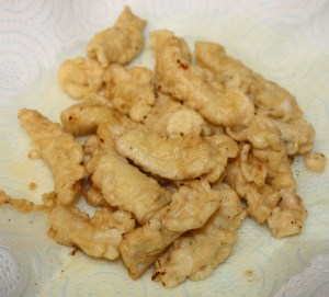 Ir sacando las tiras, escurriéndolas ligeramente, y freír en abundante aceite.