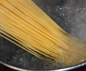 Cocer los espaguetis según las instrucciones del fabricante. Suelen ser 10 minutos en agua hirviendo con una cucharadita de sal.