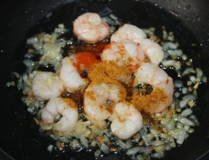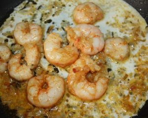 Poner las gambas. Subir el fuego al máximo ya que las gambas, aunque estén escurridas, contienen bastante agua y queremos que se evapore. Aproximadamente 1 minuto.