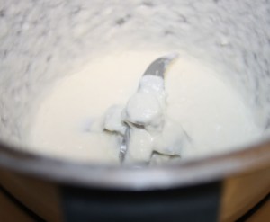 En la Thermomix, robot de cocina o batidora, triturar las dos bolas de queso con el suero de una de las bolsas.