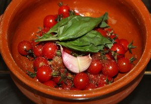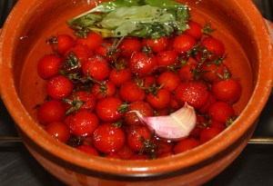 Poner a fuego fuerte y, en cuanto el aceite comience a hervir, bajar al mínimo. Dejar hasta que la piel de los tomates comience a romperse. El tiempo depende del tamaño del tomate. Se pueden conservar en ese mismo aceite varios días en la nevera.