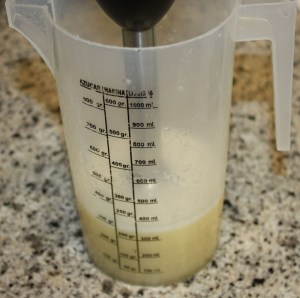 Ahora vamos a hacer el baño en el que vamos a esferificar. Mezclar el agua con el cloruro cálcico. Triturar. Reservar también en la nevera tapado con film.