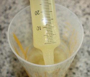 Con la jeringuilla coger el jugo de melón, e ir dejándolo caer, gota a gota, en el baño.