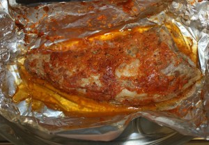 En una fuente de horno poner papel de aluminio. Colocar encima las costillas, con la carne hacia arriba e impregnarlas con salsa barbacoa. Añadir la misma cantidad de agua que de salsa. Cubrir con el papel de plata, de manera que queden bien cerradas, y meter en el horno.
