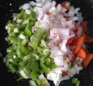 Picar la cebolla y el pimiento, al que le habremos eliminado previamente las partes blancas y las semillas.
