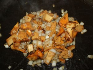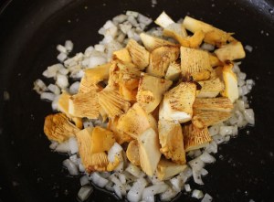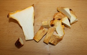 Limpiar las setas con un paño o un cepillito, para eliminar la tierra, nunca sumergiéndolas en agua, y cortar en trozos pequeños.