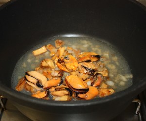 Añadir a la cazuela los mejillones con el agua donde los teníamos reservados….