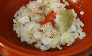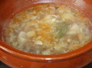 En una cazuela honda de barro, o la que tengáis, poner la cebolla, 10 minutos a fuego medio – bajo.