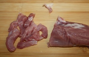 Cortar el solomillo en tiras. Eliminar la grasa que tenga. Primero cortar rodajas de 1 cm, y después cada una en tiras.