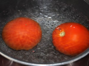 Escaldar los tomates. Meter en un cazo con agua hirviendo y una cucharadita de sal. 1 minuto. sacar y dejar enfriar.