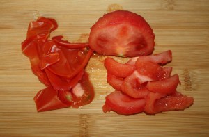 Pelar y eliminar las semillas. Si en la base del tomate le hacéis una cruz, antes de meterlos en el agua hirviendo, os será mucho mas fácil pelarlos.