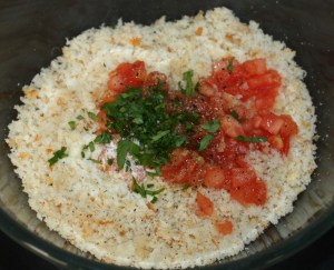 Mezclar el pan triturado con el tomate a dados, la nata, perejil picado, 2 cucharadas de AOVE y una pizca de sal y pimienta negra recién molida.