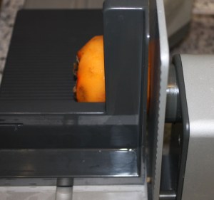 Pelar el caqui como si fuera una manzana. Cortar en finas láminas, desde la parte de abajo.