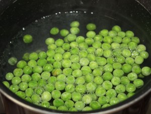 Poner un cazo con agua y una pizca de sal al fuego. Cuando el agua comience a hervir, introducir los guisantes congelados. 5 minutos.