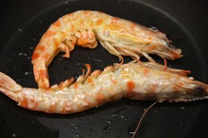 En el momento de comer, freír los langostinos en una sartén con unas gotas de aceite. Vuelta y vuelta. Pelar y cortar cada uno en tres trozos.
