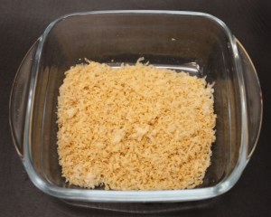 En una sartén, sin nada de aceite, dorar el pan rallado. Un minuto a fuego medio. No lo perdáis de vista ya que de un segundo a otro se os quemará. En cuanto se empiece a dorar, sacarlo.