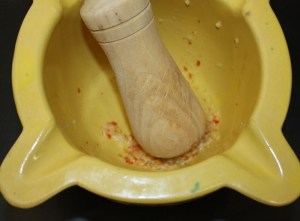 En un mortero majar el ajo pelado, las guindillas y una pizca de sal.