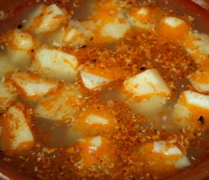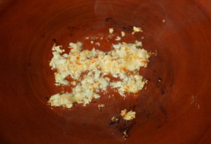 En una cazuela de barro, poner el aceite. En cuanto esté caliente añadir el majado. 1 minuto y poner el pimentón.