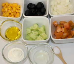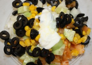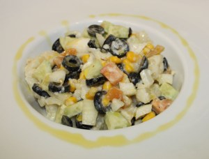 En un bol mezclar todos los ingredientes: col, pepino, tomate, cebolla, aceitunas negras, maíz y vinagreta.