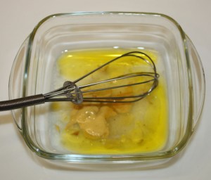 Hacer la vinagreta con el AOVE, miel, mostaza y escabeche. Emulsionar con unas varillas o un tenedor. Probar de sal y si hace falta añadirle un poco. Hay que tener en cuenta que el escabeche ya es salado.
