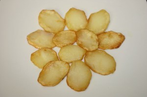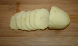Pelar la patata y cortarla en rodajas finas.