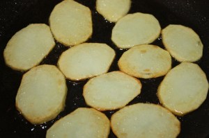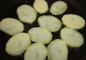 En una sartén con el aceite, dorar las patatas. Ponerles una pizca de sal.