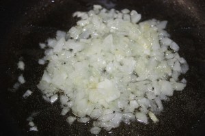En una sartén poner el aceite, la cebolla y una pizca de sal. Fuego fuerte.
