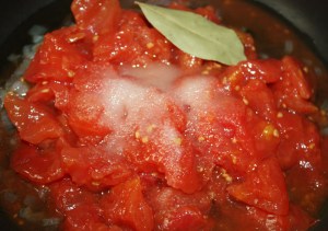 Añadir el tomate, el azúcar, el laurel y otra pizca de sal.