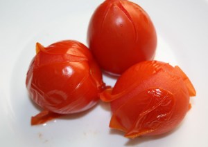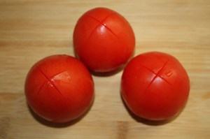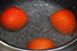 Escaldar los tomates. Si se les hace un corte en forma de cruz en la base es mucho más fácil pelarlos. Introducirlos en agua hirviendo, 1 minuto. Sacar.