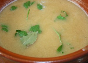 En una cazuela honda de barro calentar el caldo y el agua. Añadir el sofrito triturado. Añadir también a la cazuela, la hoja de laurel y dos ramas de perejil. Sino tenéis caldo hecho utilizar uno en tetrabrik.